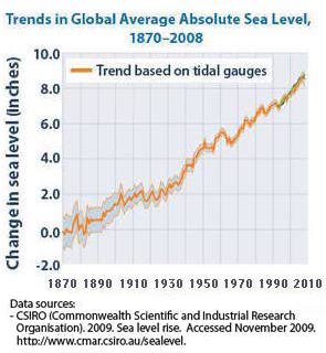 Between 1870 and 2004, global average sea levels rose 195 mm (7.7 inches), or almost 20 cm. From 1950 to 2009, measurements show an average annual rise in sea level of about 1.7 mm per year, with satellite data showing a rise of about 3.3 mm per year from 1993 to 2009, a much faster rate of increase than previously estimated.