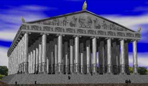 at Ephesus Constructed of parian marble and more than 400 feet long with over 100 columns 60 ft high, it was begun about 550 BC and took some 120 years to build. It was decorated with bronze statues sculpted by the most skilled artists of their time: Phidias, Polycleitus, Kresilas, and Phradmon. In 356 BC a man named Herostratus burned the temple to ground in an attempt to immortalize his name. |