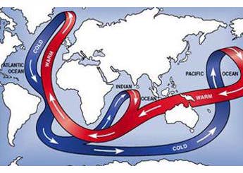 The global conveyor belt thermohaline circulation is driven primarily by the formation and sinking of deep water in the Norwegian Sea. This circulation is thought to be responsible for the large flow of upper ocean water from the tropical Pacific to the Indian Ocean through the Indonesian Archipelogo. The two counteracting forcings operating in the North Atlantic control the conveyor belt circulation: (1) the thermal forcing (high-latitude cooling and the low-latitude heating) which drives a polar southward flow; and (2) haline forcing (net high-latitude freshwater gain and low-latitude evaporation) which moves in the opposite direction.
