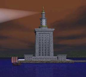 Marble lighthouse and watchtower built about 270 BC on the island of Pharos in Alexandria's harbour. Possibly standing 400 feet high, it had, at the top stage, a mirror which reflected sunlight during the day while fire was used during the night. Its reflection could be seen more than 35 miles off-shore. Of the six vanished Wonders, the Lighthouse of Alexandria was the last to disappear. It was destroyed by an earthquake in 1375. |